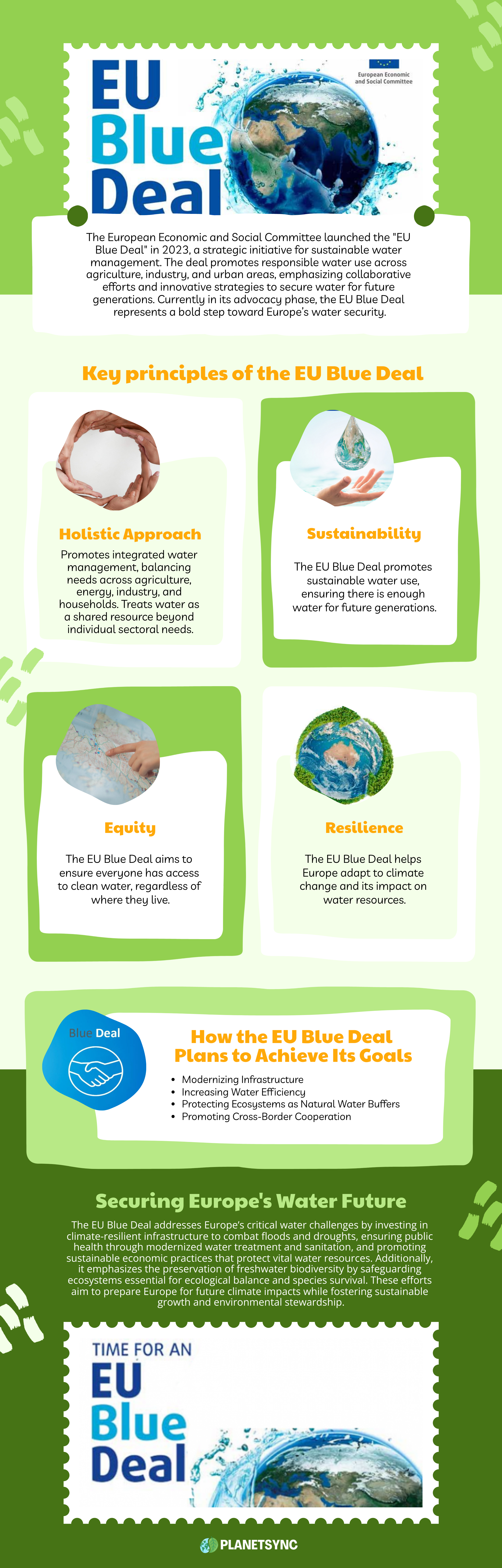 The EU Blue Deal aims to address Europe’s water challenges by promoting sustainable and responsible water use across agriculture, industry, and urban development. Currently in the advocacy and consultation phase, the Blue Deal reflects Europe’s commitment to water security through collaborative, cross-sectoral strategies. Here’s an in-depth look at its guiding principles, goals, and proposed actions.