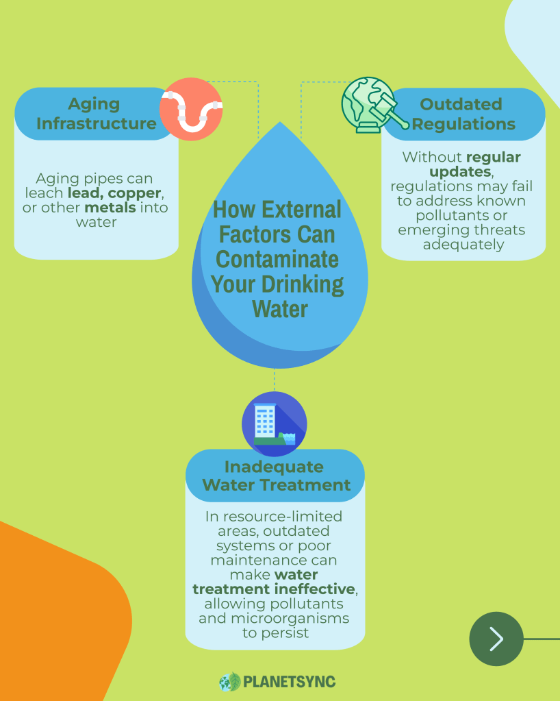 Aging water infrastructure is a significant concern in many regions. Even if water leaves the treatment plant clean, contamination can occur during distribution due to corroded pipes that leach trace amounts of lead, copper, or other metals. These issues are often localized and monitored in regions with strict water management practices but can have widespread implications in areas with inadequate maintenance and monitoring.