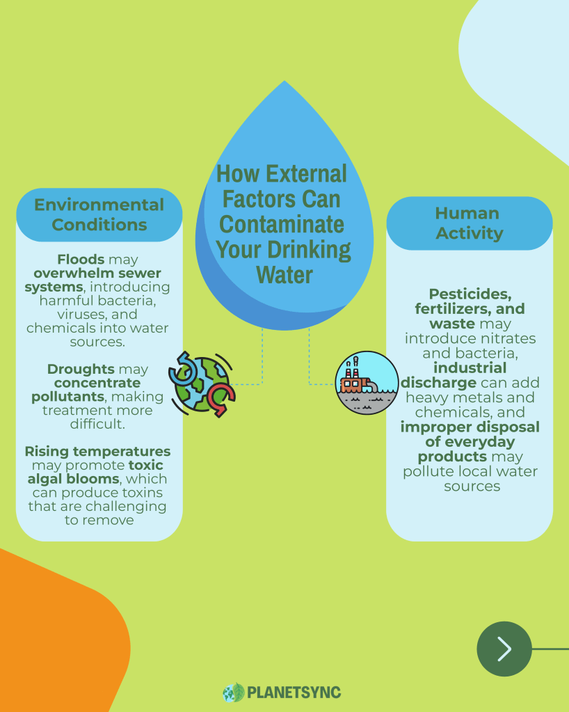 In Part I, we explored the different sources of drinking water, each with its own challenges and vulnerabilities. However, knowing where your water comes from is only part of the equation. Even the cleanest water source can be compromised by external factors. While some of these factors may be beyond your direct control, understanding them is crucial because they can impact the safety and quality of the water you rely on daily. By recognizing these risks, you can take proactive steps to safeguard your health. In this section, we’ll explore these external influences in detail and discuss when and why testing your water is a critical step in ensuring its safety and reliability.