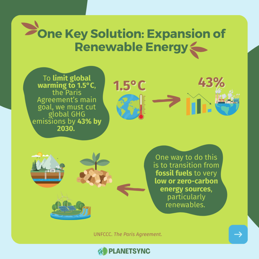To limit global warming to 1.5°C above pre-industrial levels, the core target of the Paris Agreement, global greenhouse gas emissions must fall by 43% by 2030. One way to do this is transitioning from fossil fuels to very low or zero-carbon energy sources, particularly renewables. This includes solar power, wind power, hydropower, geothermal energy, and sustainably sourced biomass.