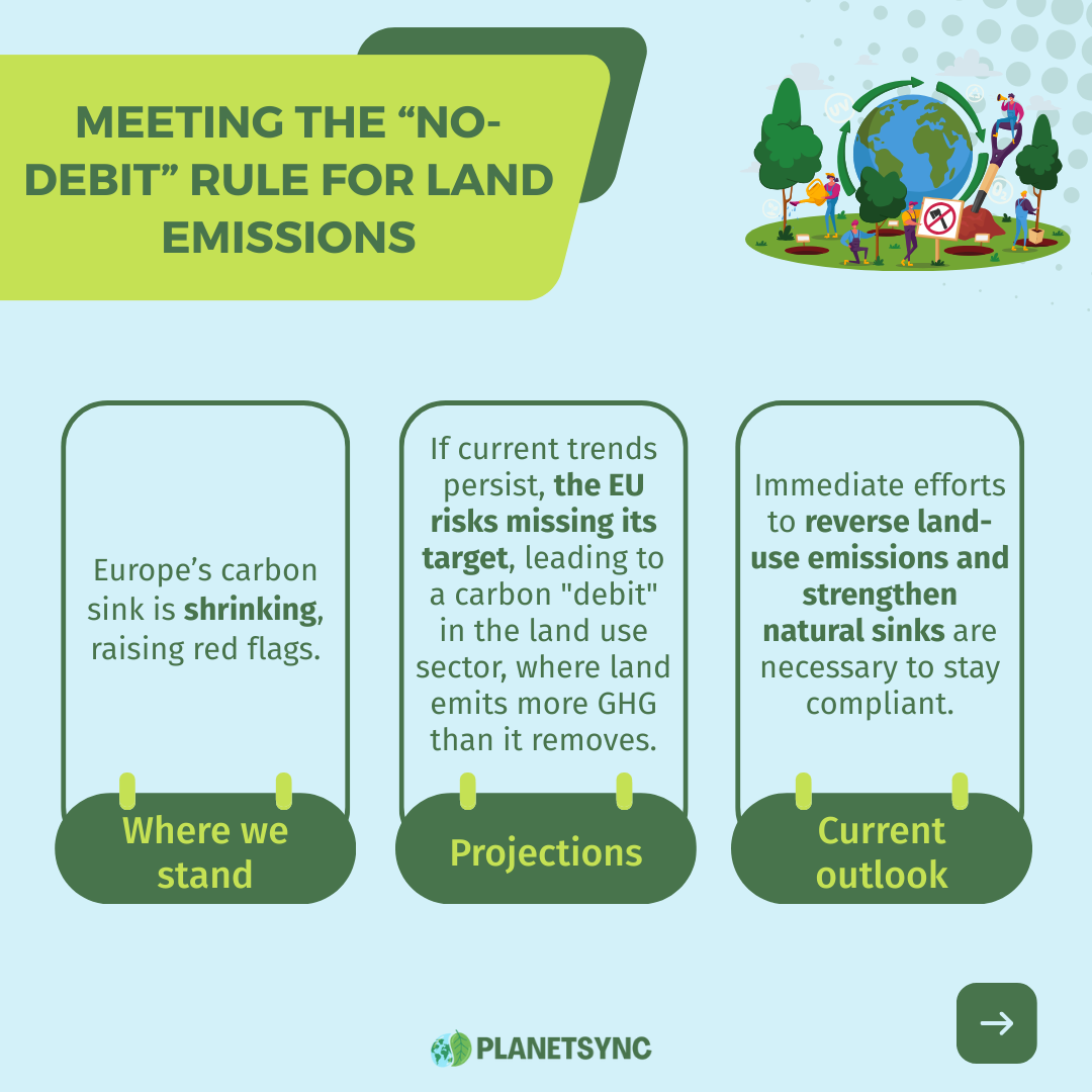 Between 2021 and 2025, each EU country must make sure that land use (like forests and agriculture) removes at least as much carbon as it emits. This is known as the “no debit” rule. The EU’s target is an average net removal of 229 million tonnes of CO₂ per year during this period. Right now, it looks like the EU might be slightly off track, especially as forest carbon sinks are shrinking due to more harvesting and natural disturbances.