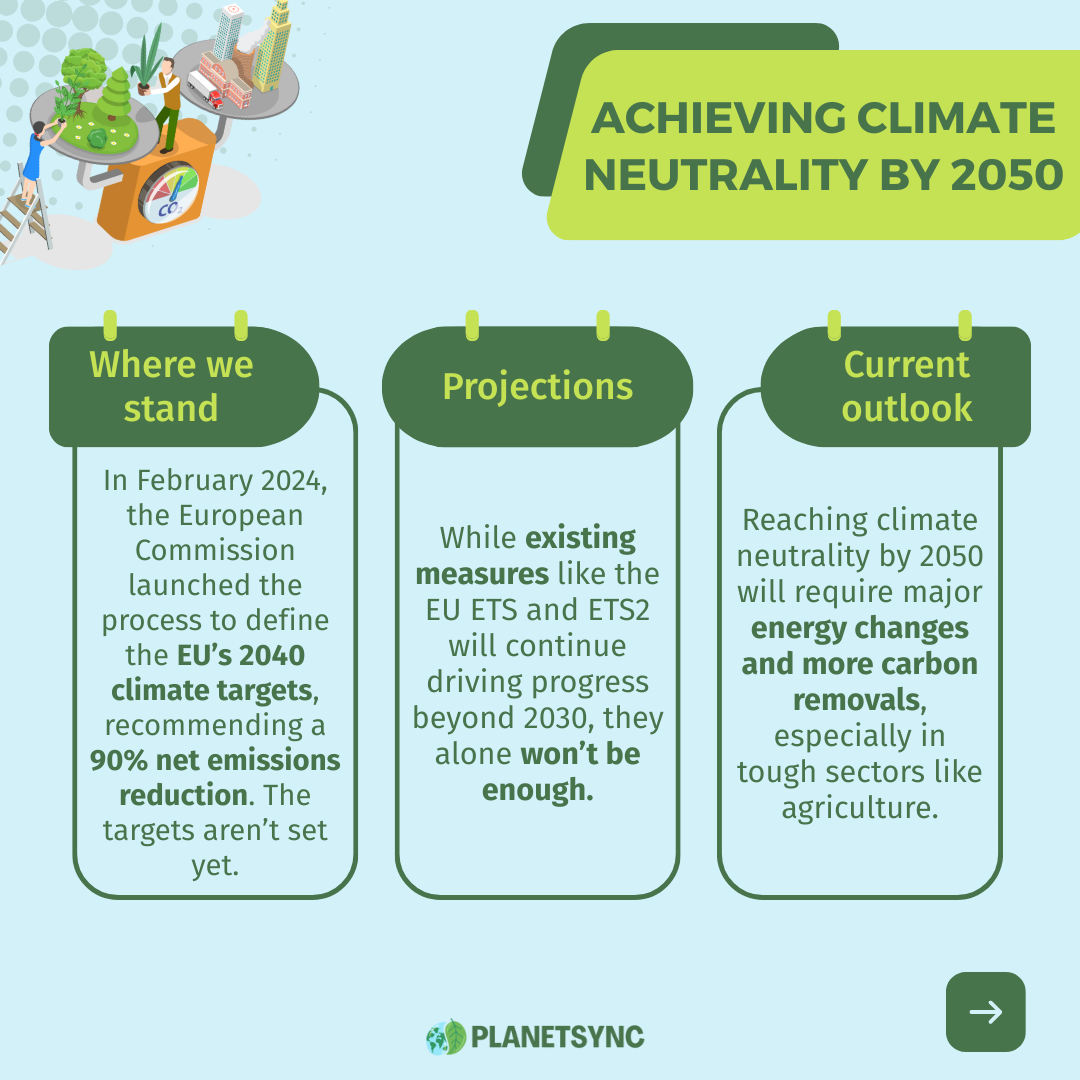 In February 2024, the European Commission adopted Communication that launches the process of establishing the EU’s climate targets for 2040. While the targets are still still to be defined, the direction is clear: achieving climate neutrality by 2050 requires that the majority of the transition be completed by 2040. To this end, the Commission has recommended an ambitious net greenhouse gas emissions reduction of 90% by 2040.