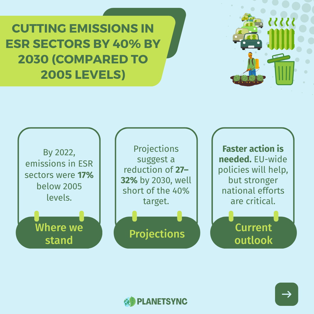 By 2022, emissions in ESR sectors were 17% below 2005 levels. Projections indicate a reduction of 27–32% by 2030, insufficient to meet the 40% goal. While EU-wide policies are expected to help, especially in transport, progress in the building sector is slower than expected, and the overall pace must increase.