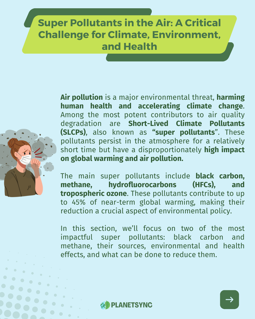 In this section, we’ll focus on two of the most impactful super pollutants: black carbon and methane, their sources, environmental and health effects, and what can be done to reduce them.