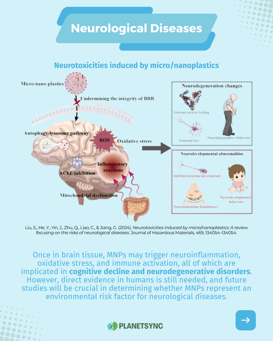 The finding that MNPs can reach the brain has opened questions about neurological effects. Once in brain tissue, these particles may trigger neuroinflammation, oxidative stress, and immune activation, all of which are implicated in cognitive decline and neurodegenerative disorders such as Alzheimer’s and Parkinson’s disease. However, direct evidence in humans is still needed, and future studies will be crucial in determining whether microplastics represent an overlooked environmental risk factor for neurological diseases.