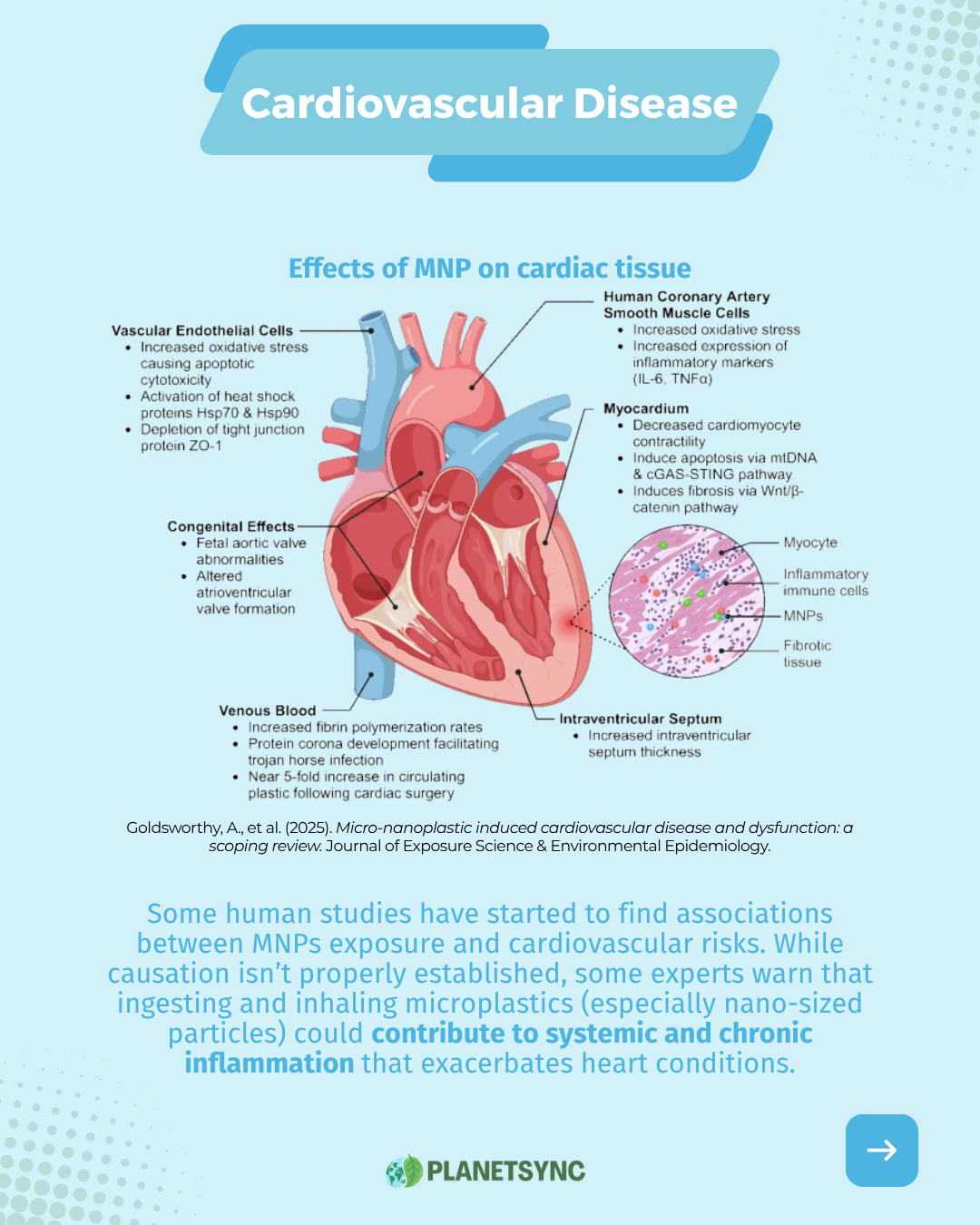 Some human studies have started to find associations between MNPs exposure and cardiovascular risks. For instance, researchers reported correlations between higher microplastic levels in human tissues and markers of cardiovascular disease. While causation isn’t properly established, some experts warn that ingesting and inhaling microplastics (especially nano-sized particles) could contribute to systemic and chronic inflammation that exacerbates heart conditions.