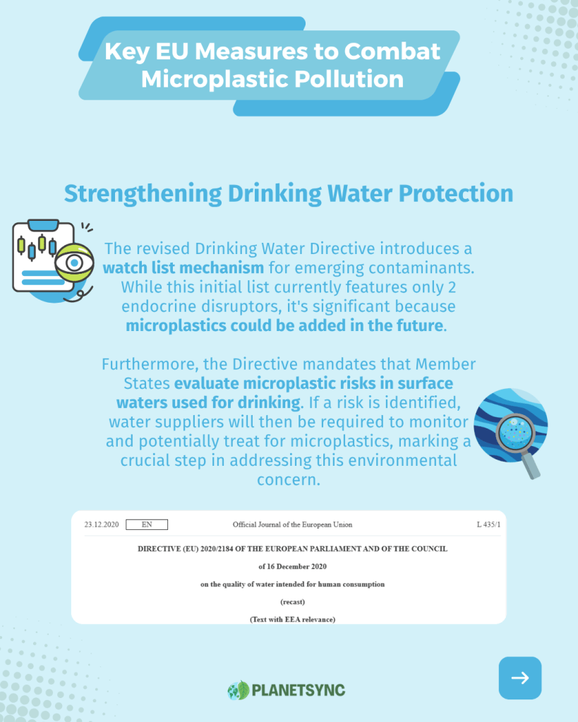 The revised Drinking Water Directive (EU 2020/2184) suggested a watch list mechanism for emerging compounds. While the initial list includes only 17-beta-estradiol and nonylphenol (endocrine-disrupting chemicals), the newly adopted measurement methodology could pave the way for microplastics to be included in future updates. Member States are required to assess microplastic risks in surface water sources used for intended for human consumption. If identified as a health risk, national authorities may require water suppliers to monitor microplastics and, if necessary, implement treatment measures to remove them.