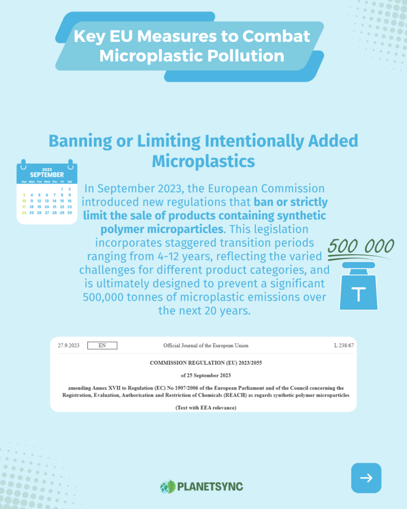 In September 2023, the European Commission introduced new restrictions which ban or strictly limit the sale of products containing intentionally added microplastic particles (defined as synthetic polymer particles ≤5 mm that are insoluble and non-biodegradable). This restriction targets products such as paints, cosmetics with plastic microbeads, detergents with microplastic fragrance capsules, agricultural fertilizers with plastic coatings, artificial sports turf infill, certain types of glitter, and more. The new rules entered into force on 17 October 2023. However, the regulation builds in transition periods of 4 to 12 years to give certain industries time to find alternatives. This restriction is expected to prevent the release of around 500,000 tonnes of microplastics over 20 years.