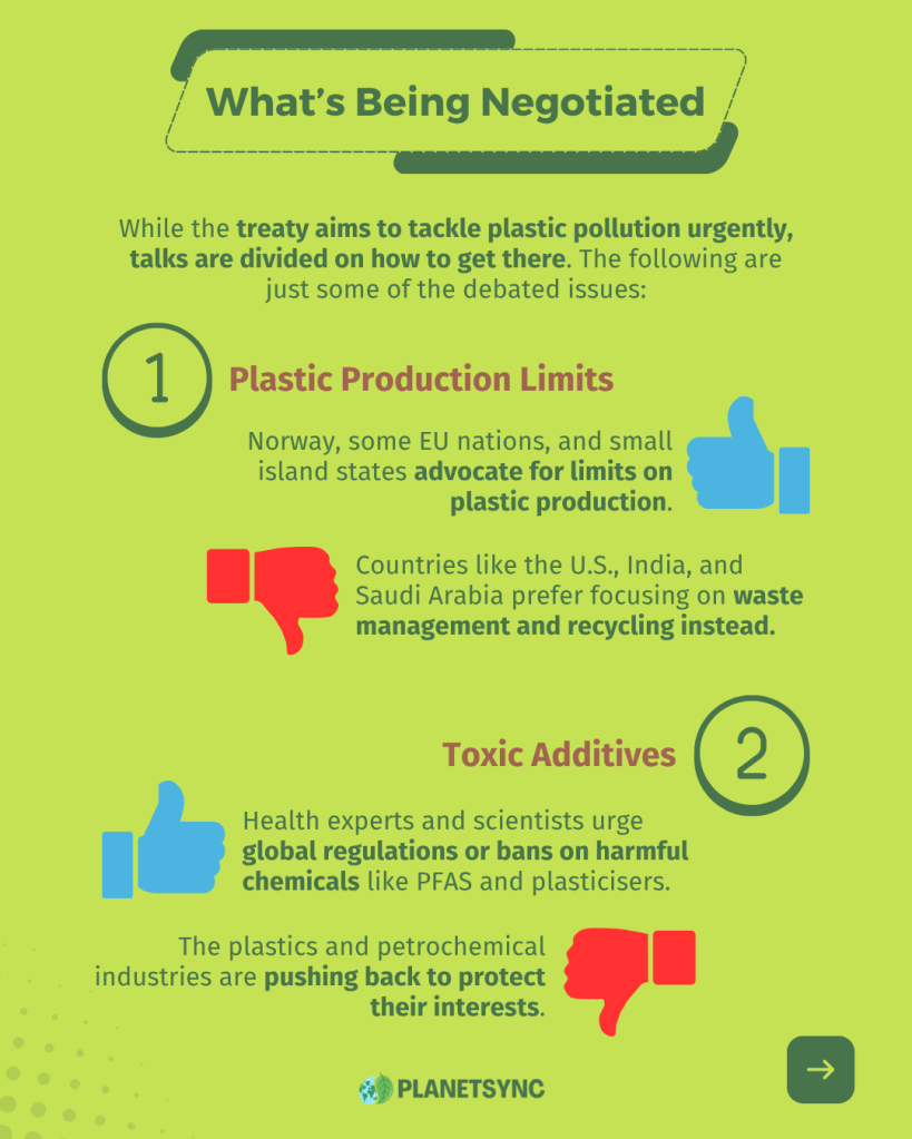While the treaty is framed as bold and urgent, the reality inside negotiation rooms is far more complex. One of the most contentious issues is whether to impose limits on plastic production itself. Countries like Norway, several EU members, and small island nations are pushing for caps, arguing that the only way to reduce pollution is to reduce how much plastic is made in the first place. But major fossil fuel producers, including the United States, India, and Saudi Arabia, strongly oppose this, insisting the focus should be on improving waste management and recycling systems instead.
