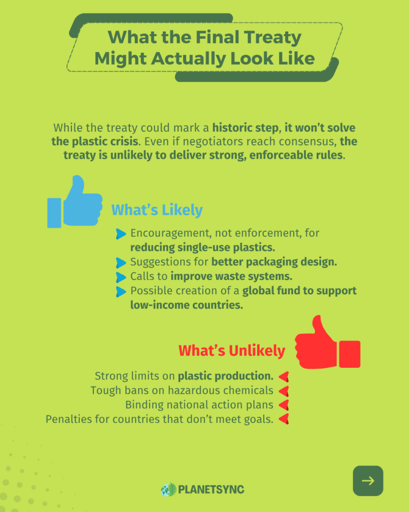 Here’s the honest take: the Geneva talks won’t solve the plastic crisis. Even if negotiators reach consensus, the treaty is unlikely to deliver strong, enforceable rules. What we’re more likely to see is a framework filled with broad language: encouragement to reduce single-use plastics, suggestions to consider design changes (like making packaging easier to reuse or recycle), calls to improve waste systems, and perhaps a global fund to support lower-income countries.