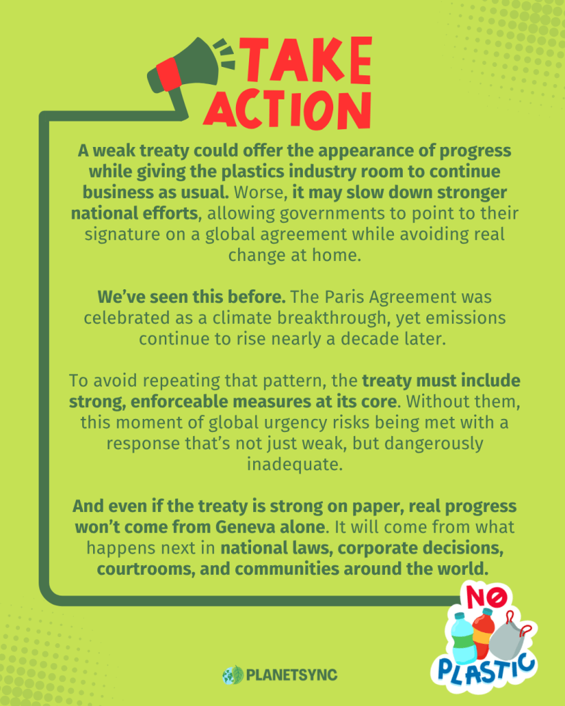 Unfortunately, a weak treaty isn’t “better than nothing.” It risks offering the illusion of action while allowing the plastics industry to continue business as usual. It could delay stronger national policies and give governments cover to say, “we signed the treaty,” while doing next to nothing at home.