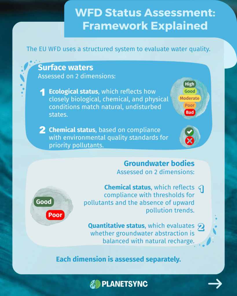 The WFD applies a structured framework to assess both surface and groundwater bodies.