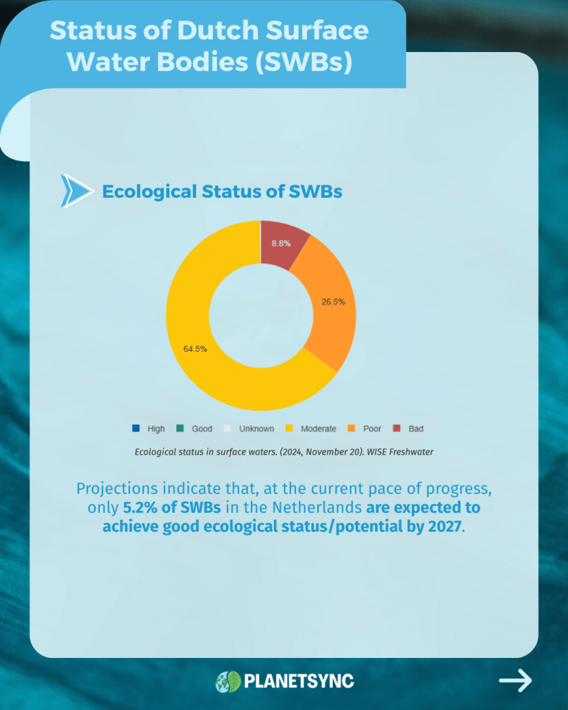 The third Dutch River Basin Management Plan (RBMP 2022–2027) underscores that the Netherlands remains far from achieving its ecological targets. Not a single surface water body currently meets good or high ecological status. Instead, 64.5% of SWBs are classified as moderate, 26.5% as poor, and 8.8% as bad, with a further 0.2% unclassified due to insufficient data.