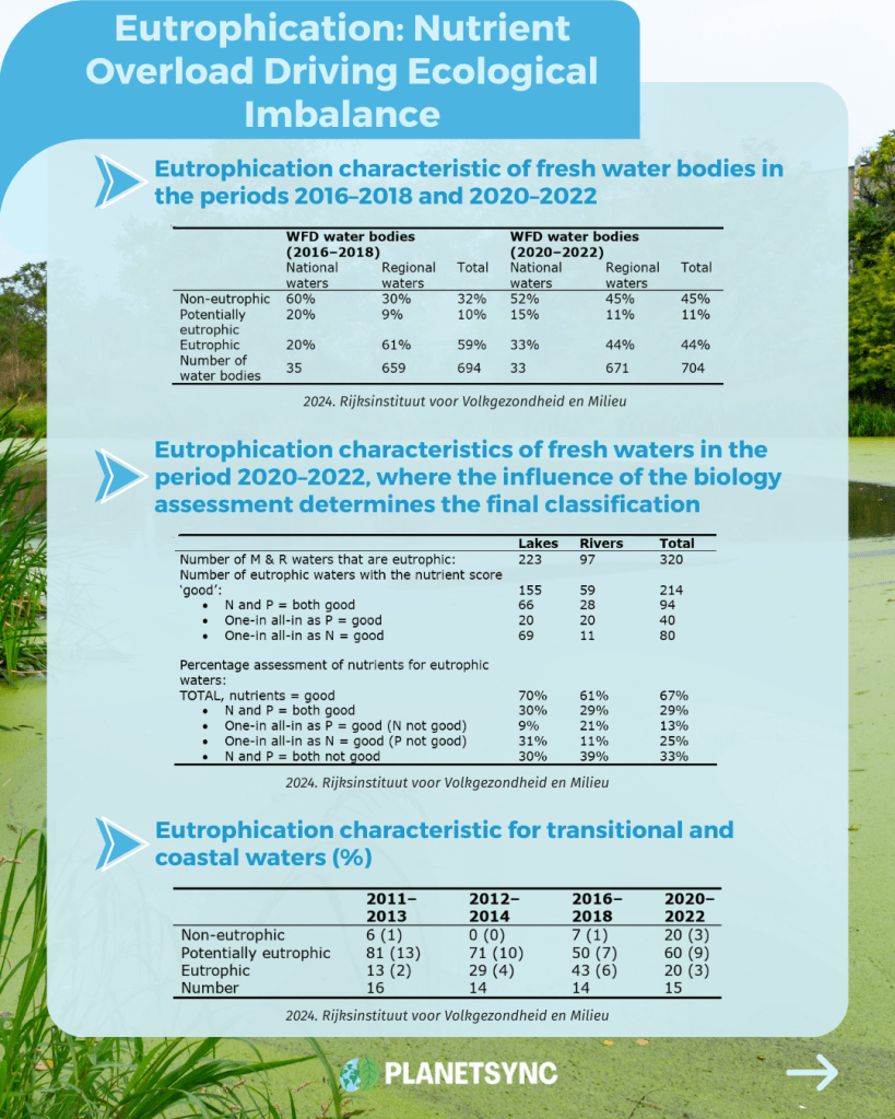 According to the Dutch National Institute for Public Health and the Environment (RIVM), 44% of Dutch freshwater bodies designated under the WFD were classified as eutrophic in 2023, meaning biological quality failed to meet standards. A further 45% were classified as non-eutrophic, meaning both their biological and nutrient conditions were acceptable. The remaining 11% were potentially eutrophic, meeting biological standards for now but with nutrient concentrations high enough to threaten future degradation. In costal and transitional waters, 20% of monitored waters were eutrophic, 20% non-eutrophic, and 60% potentially eutrophic.