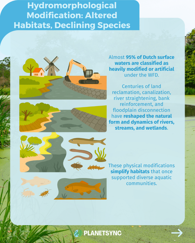 Almost 95% of Dutch surface waters are classified as heavily modified or artificial under the WFD. Centuries of land reclamation, canalization, river straightening, bank reinforcement, and floodplain disconnection have reshaped the natural form and dynamics of rivers, streams, and wetlands.