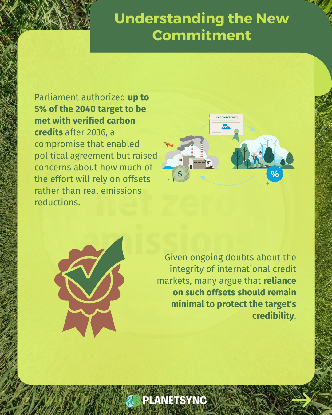 The 90 % reduction is framed as a “net” objective, meaning emissions cuts within the EU can be complemented by removals and, to a limited extent, by international carbon credits. Parliament agreed that up to 5% points of the 2040 target may be met through verified credits from outside the EU after 2036. This flexibility helped secure enough political support, though it raises questions about how much of the transition will come from genuine domestic reductions. Given concerns about the reliability of international credit markets, many observers argue that reliance on offsets should be minimal to preserve the credibility of the overall effort.