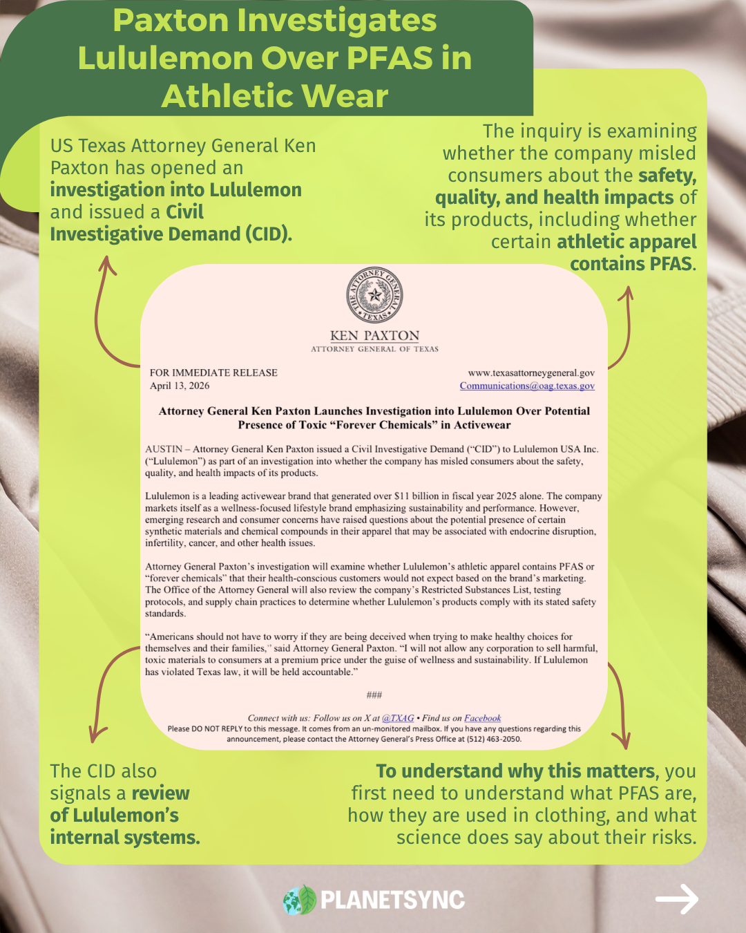 Texas Attorney General Ken Paxton announced on April 13, 2026, that his office has opened an investigation into Lululemon and issued a Civil Investigative Demand (CID). The inquiry is examining whether the company misled consumers about the safety, quality, and health impacts of its products, including whether certain athletic apparel contains PFAS.