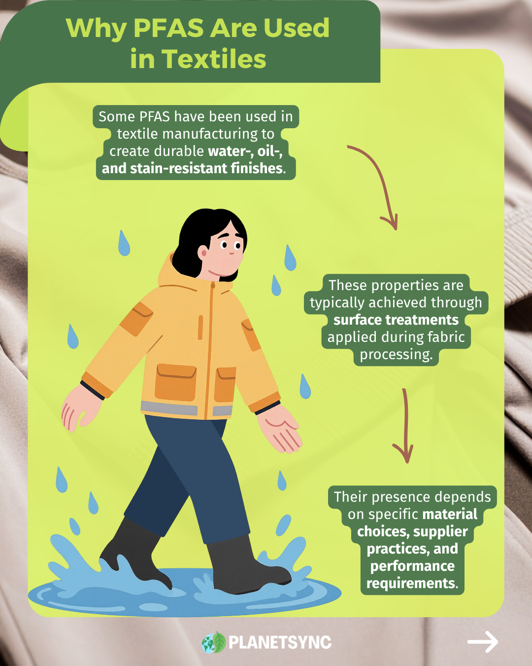 Some PFAS have been used in textile manufacturing to create durable water-, oil-, and stain-resistant finishes. These properties are typically achieved through surface treatments applied during fabric processing.