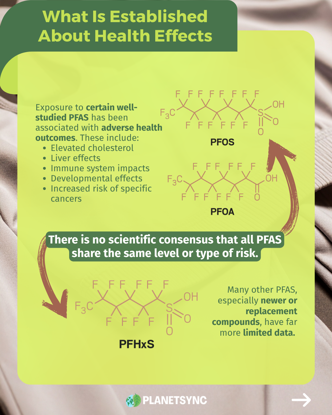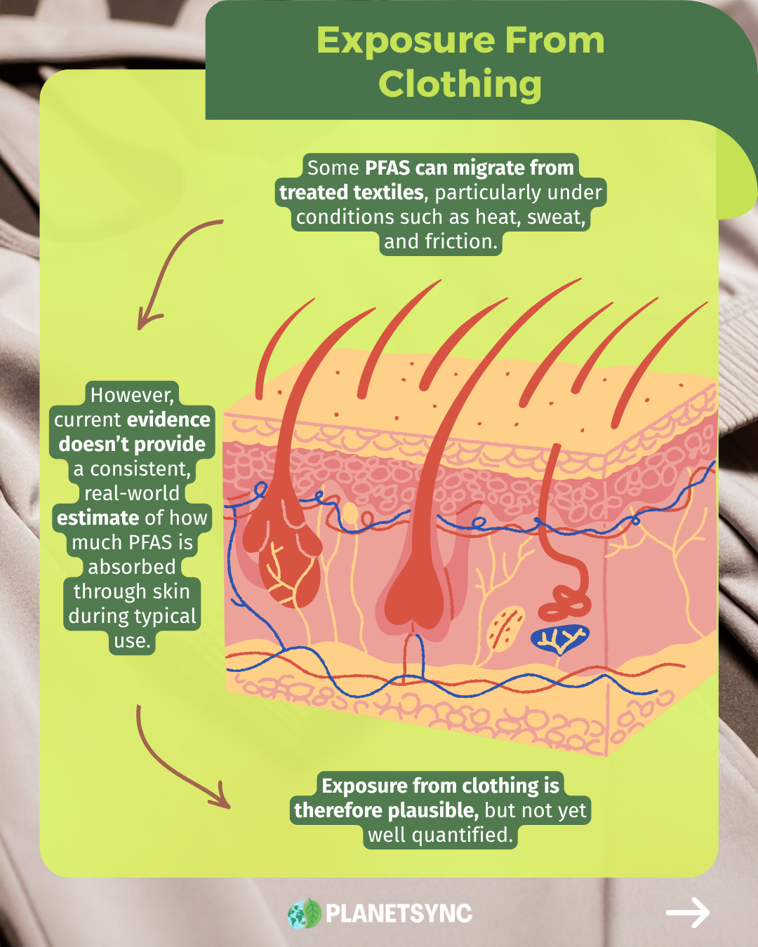 For apparel, the primary pathway under consideration is dermal exposure. Some PFAS can migrate from treated textiles, particularly under conditions such as heat, sweat, and friction.