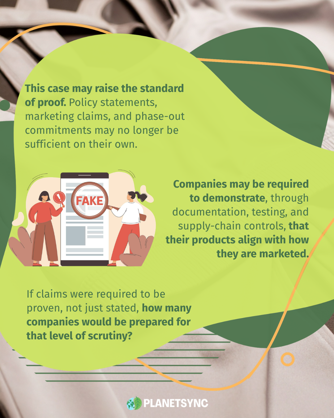 This case may raise the standard of proof. Policy statements, marketing claims, and phase-out commitments may no longer be sufficient on their own. Companies may be required to demonstrate, through documentation, testing, and supply-chain controls, that their products align with how they are marketed.